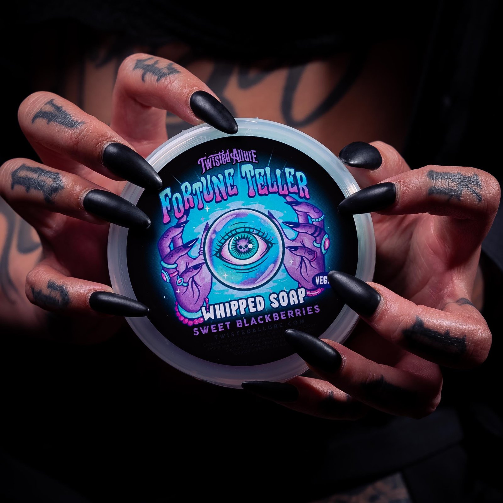 Blue and black layers lather into sweet blackberry mystery—suds so smooth, even your future feels soft.